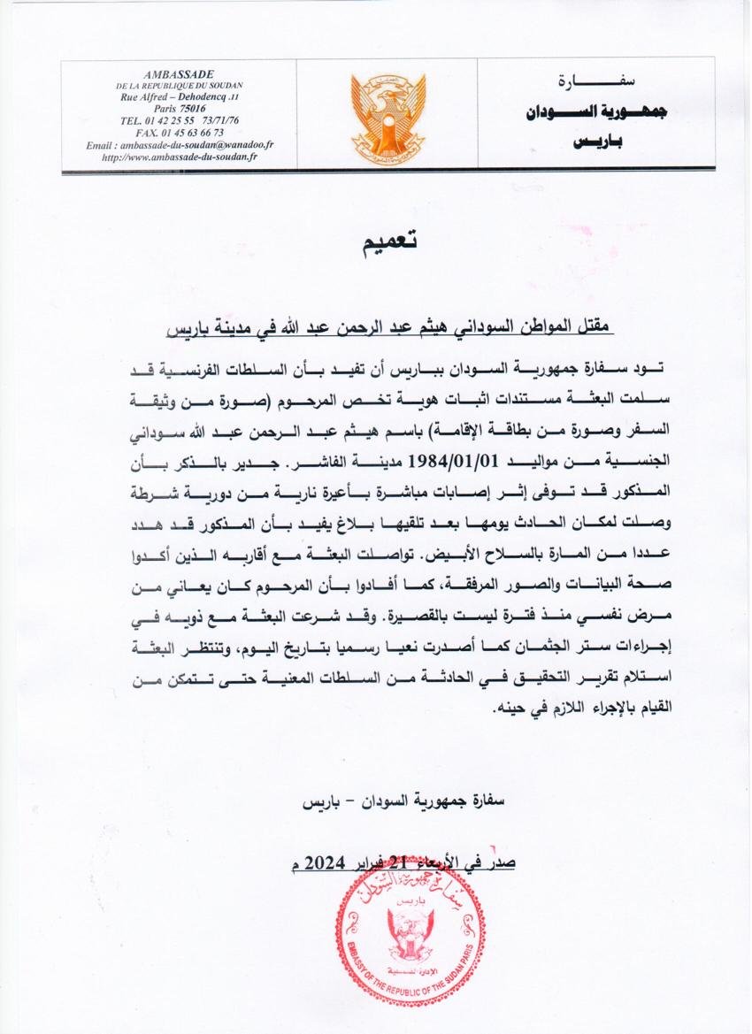 متابعات- تاق برس- أعلنت سفارة السودان في فرنسا، عن تلقيها، مستندات اثبات هوية تخص المواطن السوداني هيثم عبد الرحمن عبد الله، الذي قتل في مدينة باريس، عبارة عن “صورة من وثيقة السفر وصورة من بطاقة الإقامة باسمه” من مواليد 1984/01/01 مدينة الفاشر.