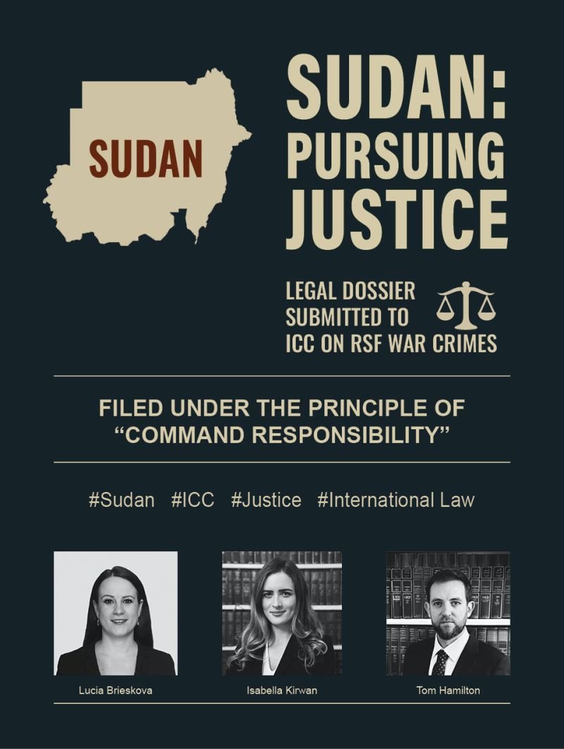 الفريق القانوني يضم المحامين لوشيا بريشكوڤا، إيزابيلا كيروان، وتوم هاميلتون، ويستند إلى مبدأ “المسؤولية القيادية” لمحاسبة قادة الدعم السريع جنائياً.