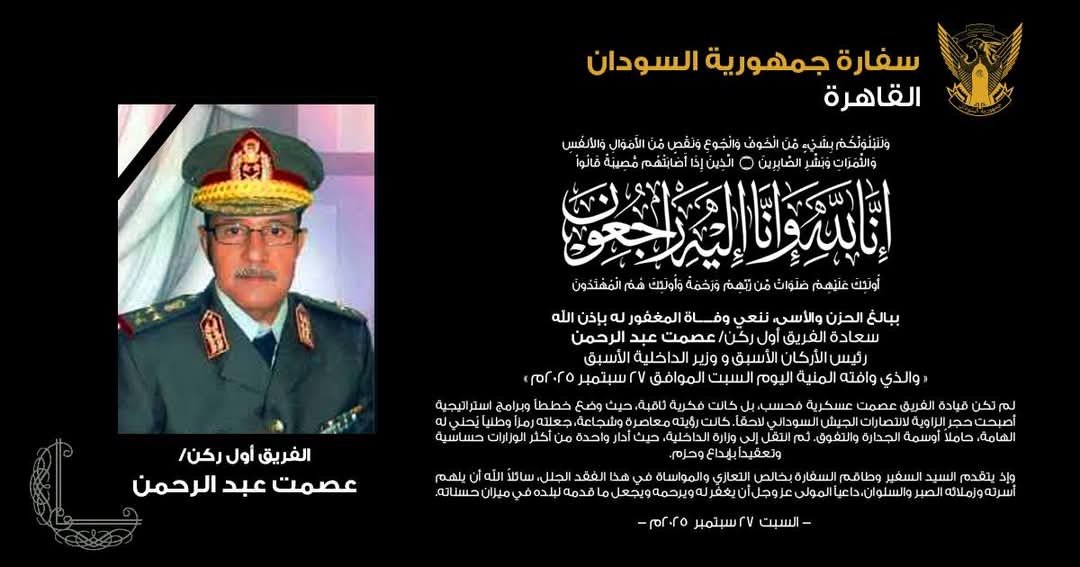 استراتيجياته السابقة نصرت الجيش حاليا.. سفارة السودان في القاهرة تنعي وزير الداخلية الأسبق