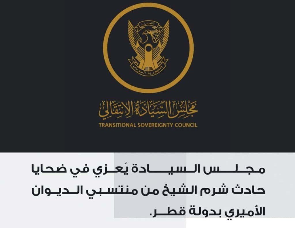 متابعات- تاق برس- قدّم مجلس السيادة الانتقالي تعازيه الحارة لحكومة وشعب دولة قطر الشقيق، في ضحايا الحادث المروري الذي أودى بحياة عدد من منتسبي الديوان الأميري، والذين استشهدوا اليوم في مدينة شرم الشيخ بجمهورية مصر العربية أثناء تأدية مهامهم الرسمية.