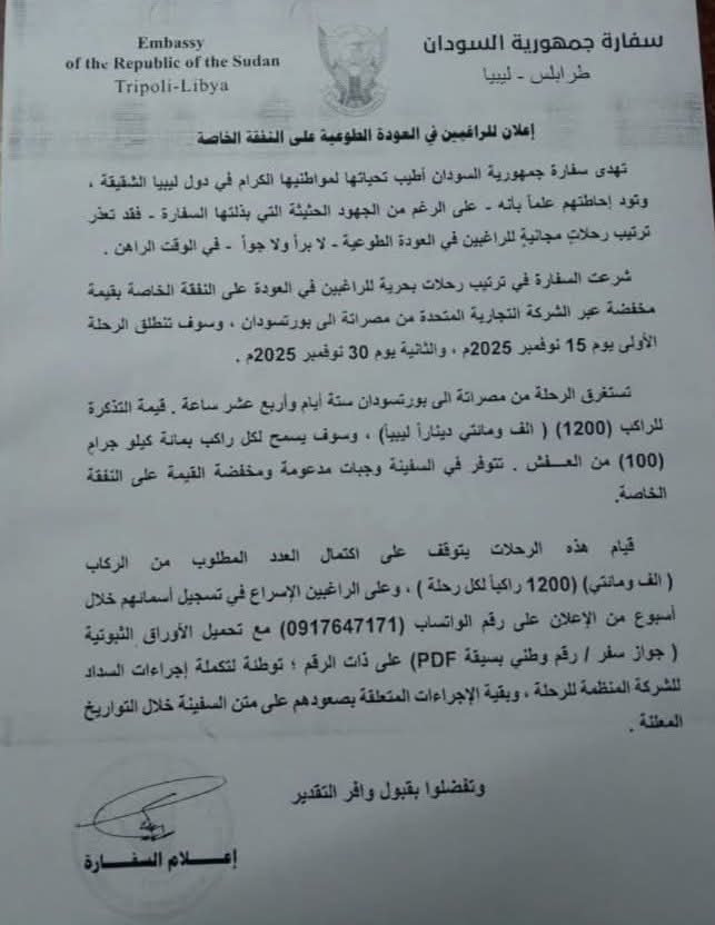 وشددت السفارة السودانية في طرابلس أن قيام الرحلات رهين بإكتمال عدد الركاب داخل الباخرة البالغ 1200 راكب.