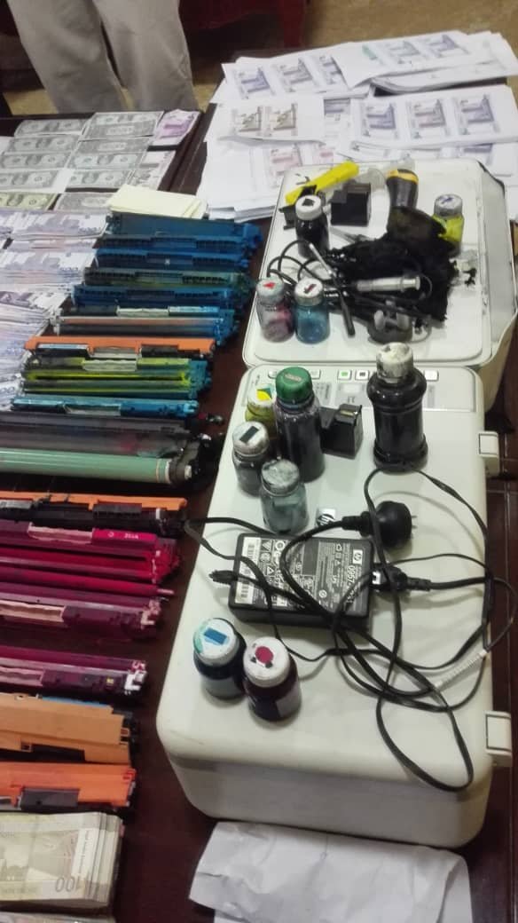 وذكرت مصادران حصيلة المقبوضات شملت عدد أثنين ماكينة طباعة ذات تقنية عالية بجانب كمية من الأحبار ومشارط تسعمل في عملية التزييف بجانب مبالغ مالية مزيفة تقدر بمبلغ خمسمائة مليون ذات فئات كبيرة (500/200/100) جنيه وكذلك مبلغ ألف دولار فئة المائة دولار .