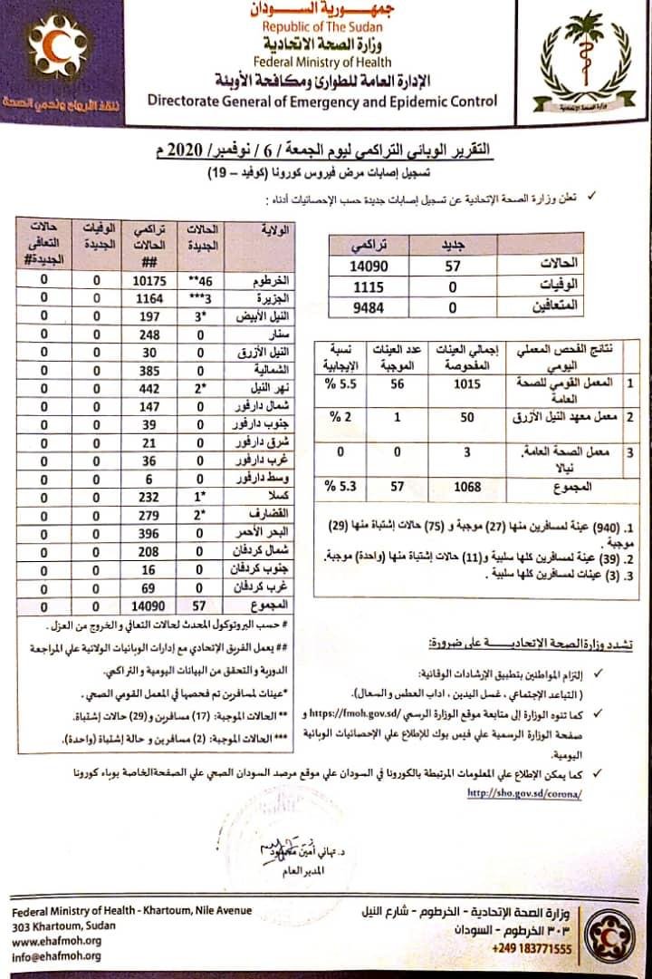 ونوهت الوزارة إلى أن حالات الإصابات التراكمية بالفيروس في السودان ارتفعت إلى 14090 حالة، فيما بقيت حالات الوفيات في 1115، وحالات التعافي 9484 حالة.
