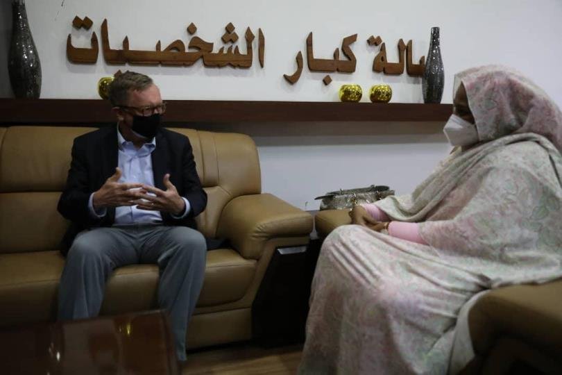 وكان في استقبال المبعوث الأمريكي مريم الصادق المهدي وزيرة الخارجية.