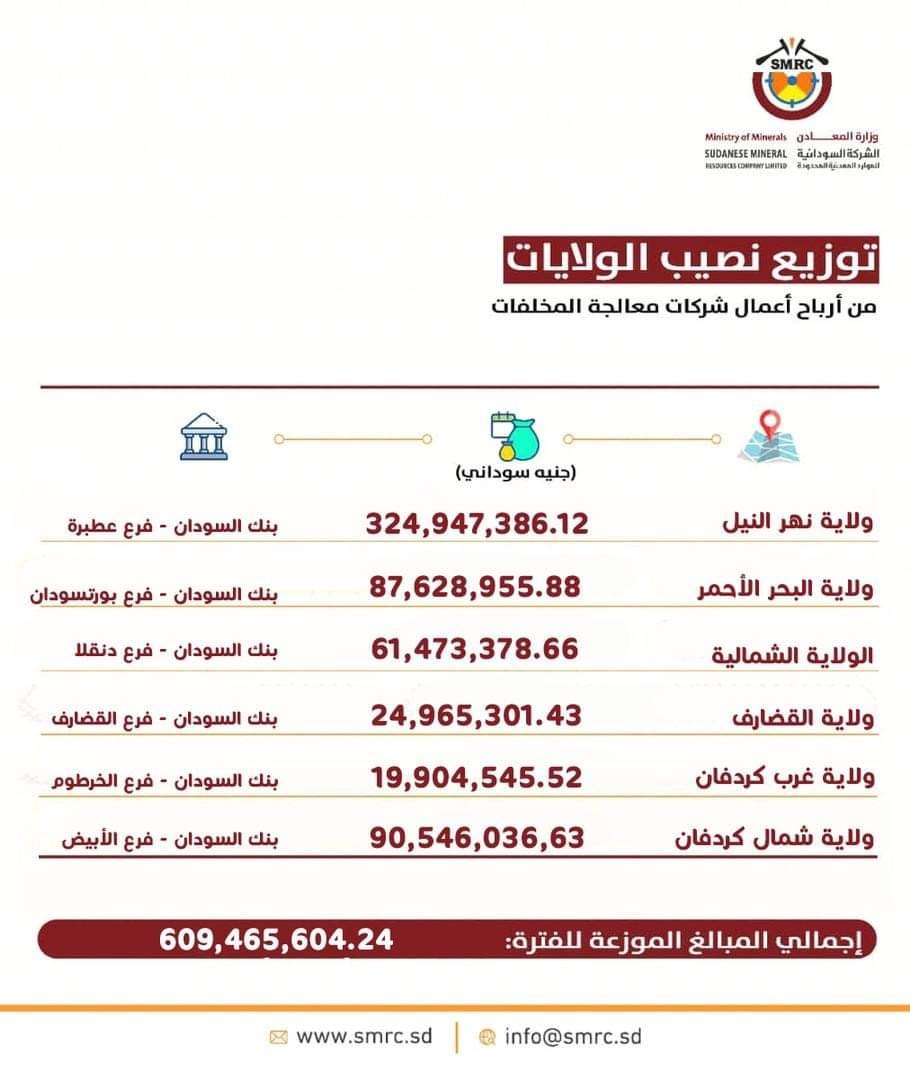 وكشف عن حجم المبالغ التي تحويلها إلى الولايات المستفيدة والتي تتصدرها ولاية نهر النيل التي تعد أكبر ولايات البلاد إنتاجاً للذهب ووجوداً للمعدنيين وإيراداً لخزينة الدولة.